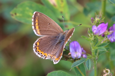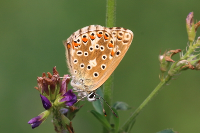 a fabulously marked female, with a full set of orange uph lunules and even a reasonable set on the upf. There is a smattering of blue scales, most pronounced at the outer edges of the uph lunules. The female is quite variable, usually plain brown, 5908 being quite strongly marked compared to the norm. |