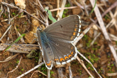 A species with restricted range in the UK, but occurring in nearly every French département, sometimes very common, and often found where the larval hostplant Horseshoe Vetch (Hippocrepis comosa) grows. It is slightly larger than the Common Blue (P. icarus) with which it is most likely to be confused, at least on a frequency basis. The male upperside is a very distinctive bright blue, often discernible in flight, with the characteristic black chequering on the white margins where the veins cut the margin. There are occasionally black spots in the marginal areas of the uph; there is a species known as the Spotted Adonis Blue (P. punctifera) but this does not occur in France.