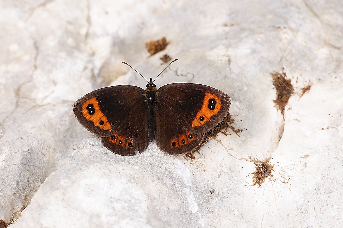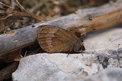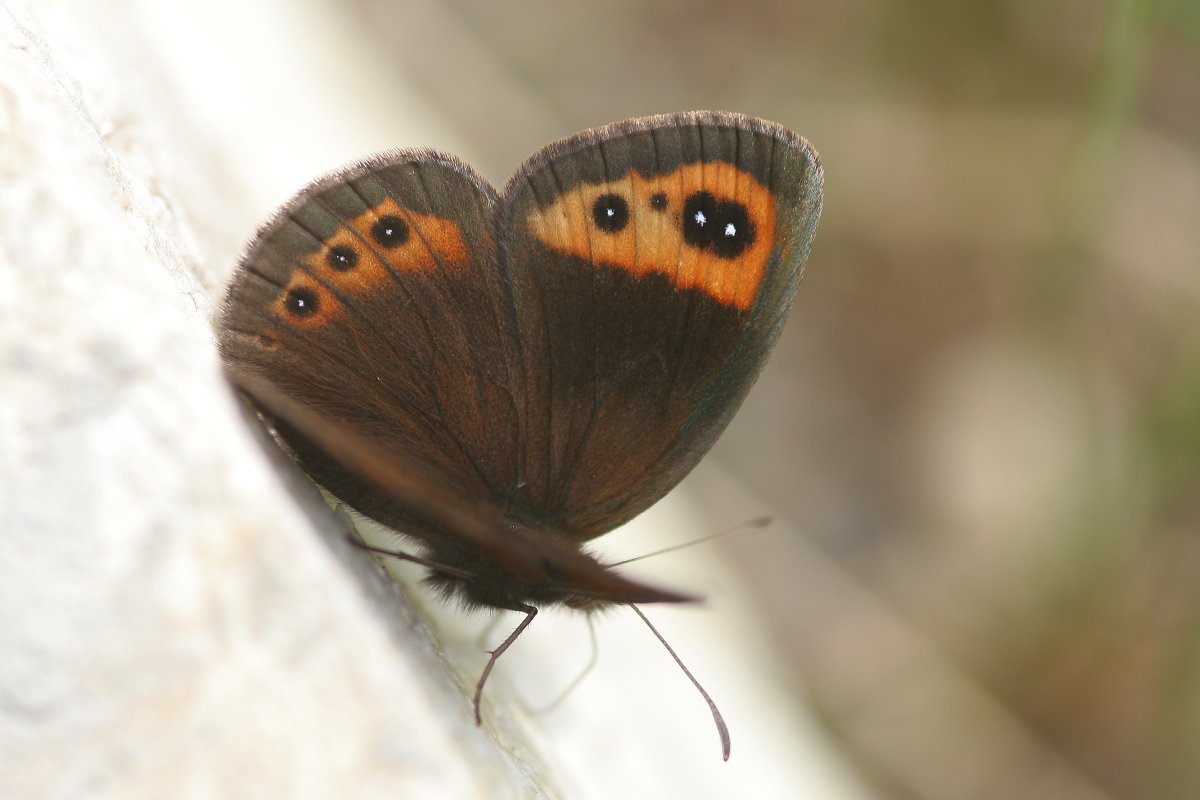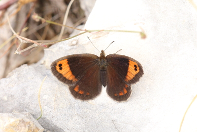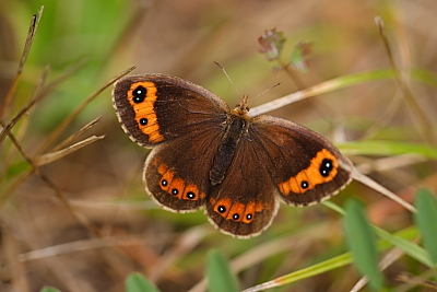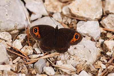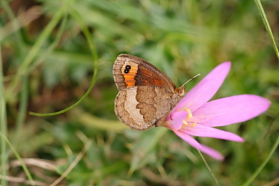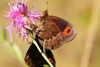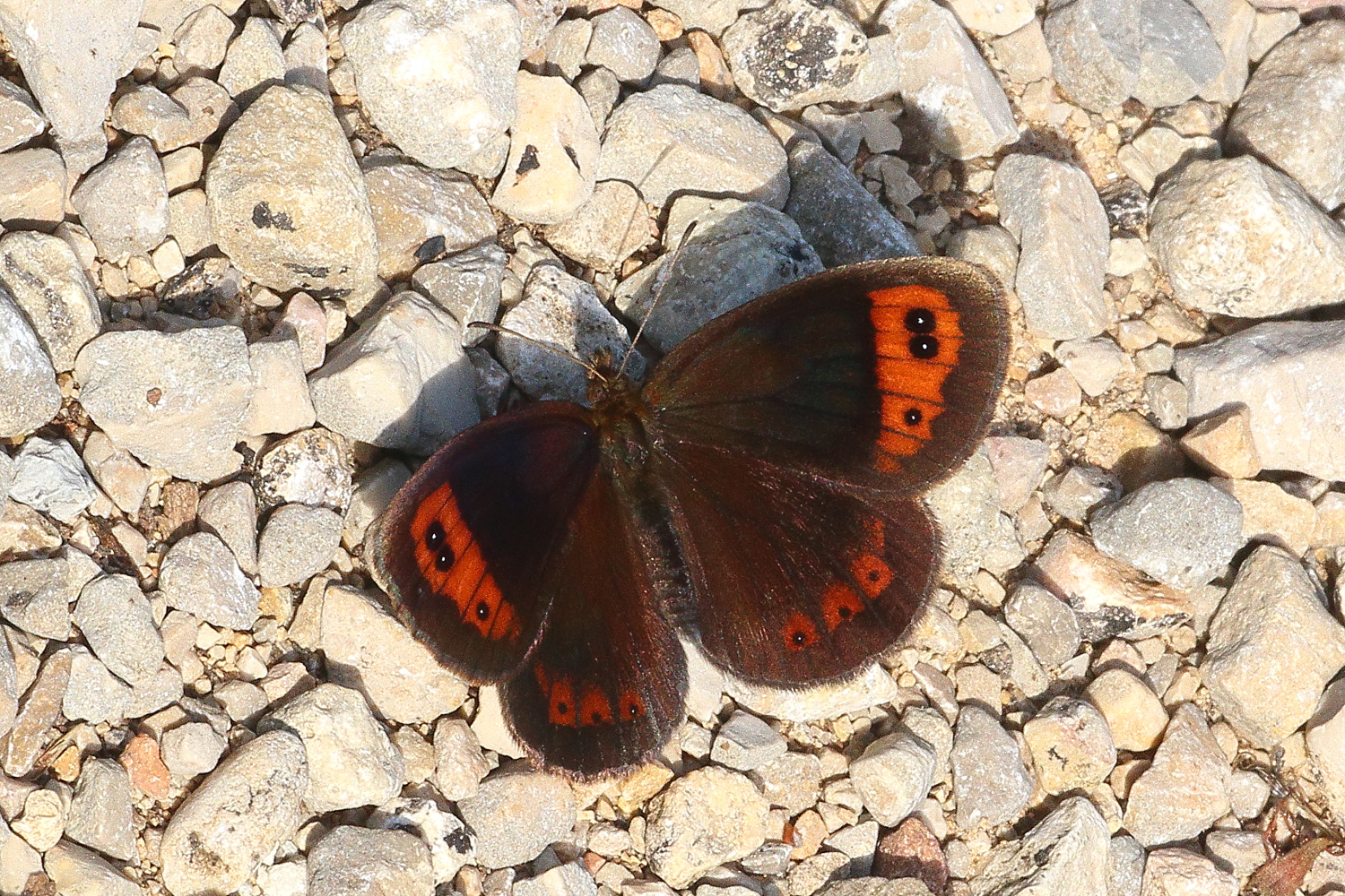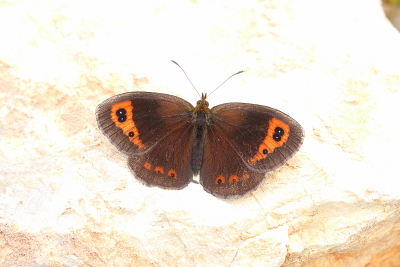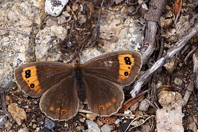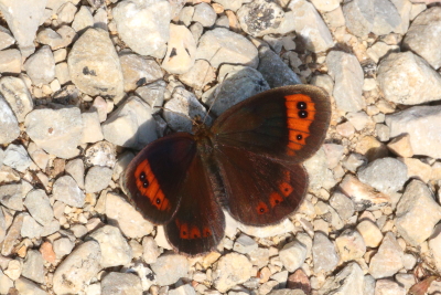 I had not seen neoridas before 2006 because my visits to France were in July, and the reason is now clear why: they do not emerge until mid-August. However, when they do come out they are everywhere, and often very common. They do not require the minimum altitude levels of many Erebia (Lafranchis says as low as 500m), and I have found them at 600m and above, up to 1800m. As with most Erebia, the female uppersides have more extensive and wider orange bands and larger ocelli, and the orange patches are quite jagged (more jagged on the unf band), whereas most Erebia have smooth-edged bands (it seems to me), so this may help in identifying it. |