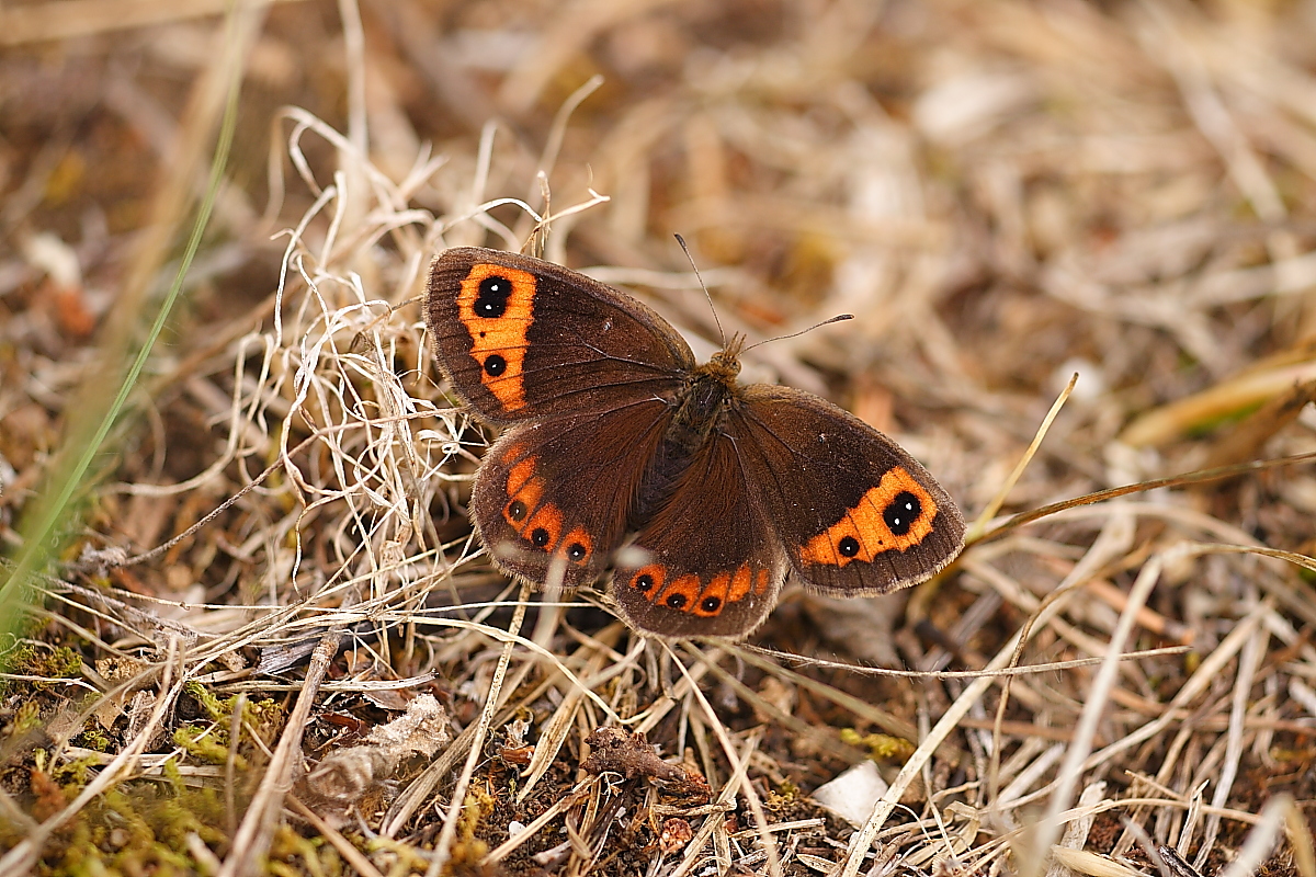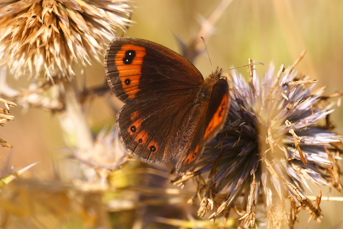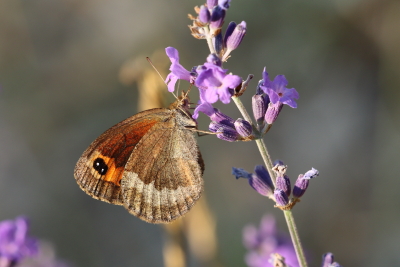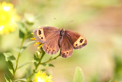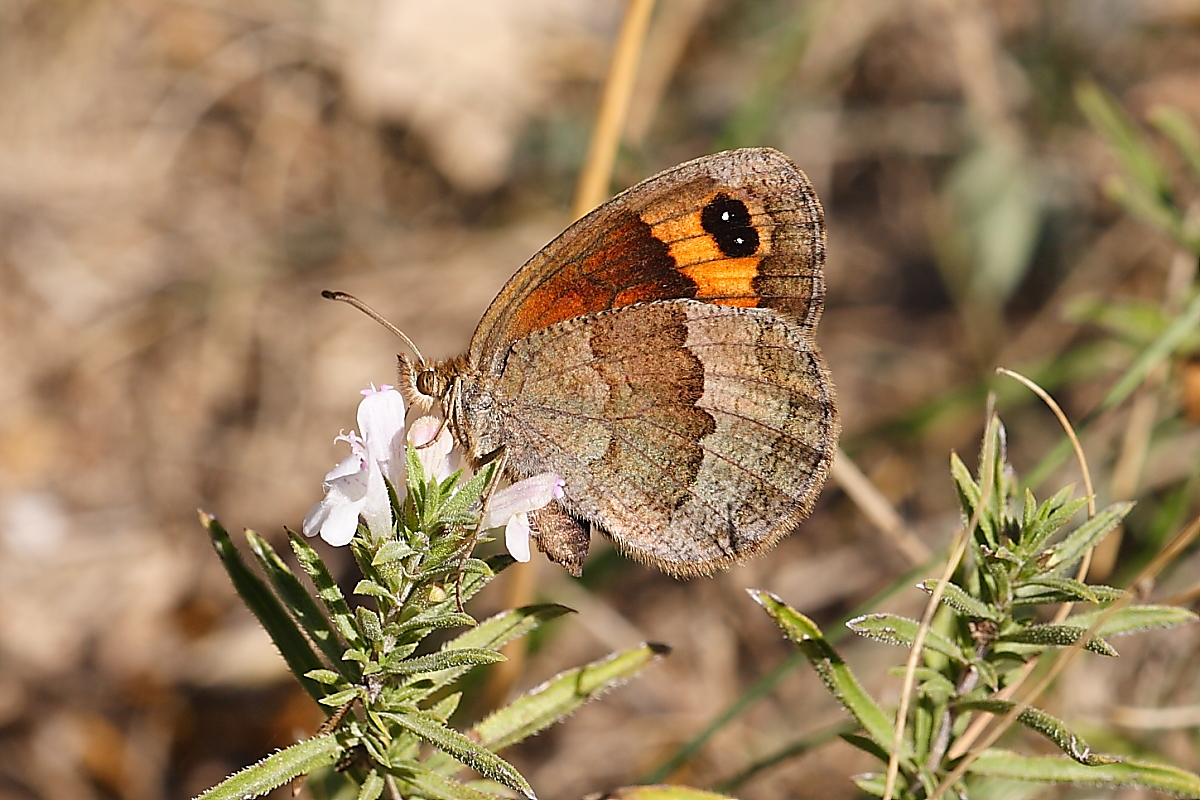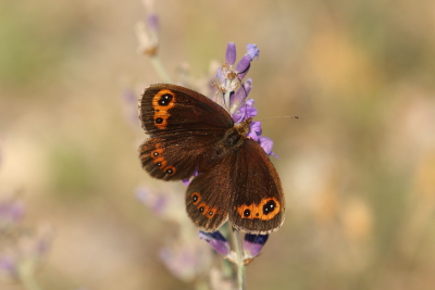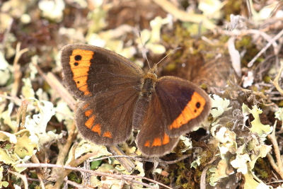 I had not seen neoridas before 2006 because my visits to France were in July, and the reason is now clear why: they do not emerge until mid-August. However, when they do come out they are everywhere, and often very common. They do not require the minimum altitude levels of many Erebia (Lafranchis says as low as 500m), and I have found them at 600m and above, up to 1800m. As with most Erebia, the female uppersides have more extensive and wider orange bands and larger ocelli, and the orange patches are quite jagged (more jagged on the unf band), whereas most Erebia have smooth-edged bands (it seems to me), so this may help in identifying it. |