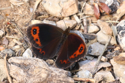 a male(?), with a strong red upf post-discal band extending well into s1. The three uph ocelli are very large, touching and even cutting the lower edge of the band, and with very bright white centres, much stronger than the illustration in T&L, and suggesting female, but I feel it is a male based on what can be seen of the body shape. |