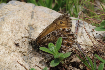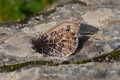 45362 | M | a male, based on the paler markings and smaller ocellus. It was in company with 45363 and the two descended from a steep rocky scree only intermittently (i.e. on only two occasions in three hours - some degree of dedication is required for this species). Its behaviour seemed entirely normal and its rather odd-looking flat pose on this rock did not seem to indicate that there was anything wrong with it. | 2370 |