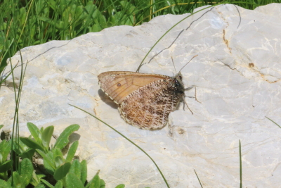 A butterfly of high altitudes, with a fairly early flight period. It is the only species of grayling to occur at high altitudes, so impossible to confuse with any of its Hipparchia cousins (not that glacialis is of the genus Hipparchia), although if the forewing is not visible (and it never settles with open wings) it is superficially similar to one or two of the Erebia ringlets, principally the Marbled Ringlet (Erebia montana). |