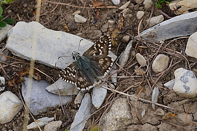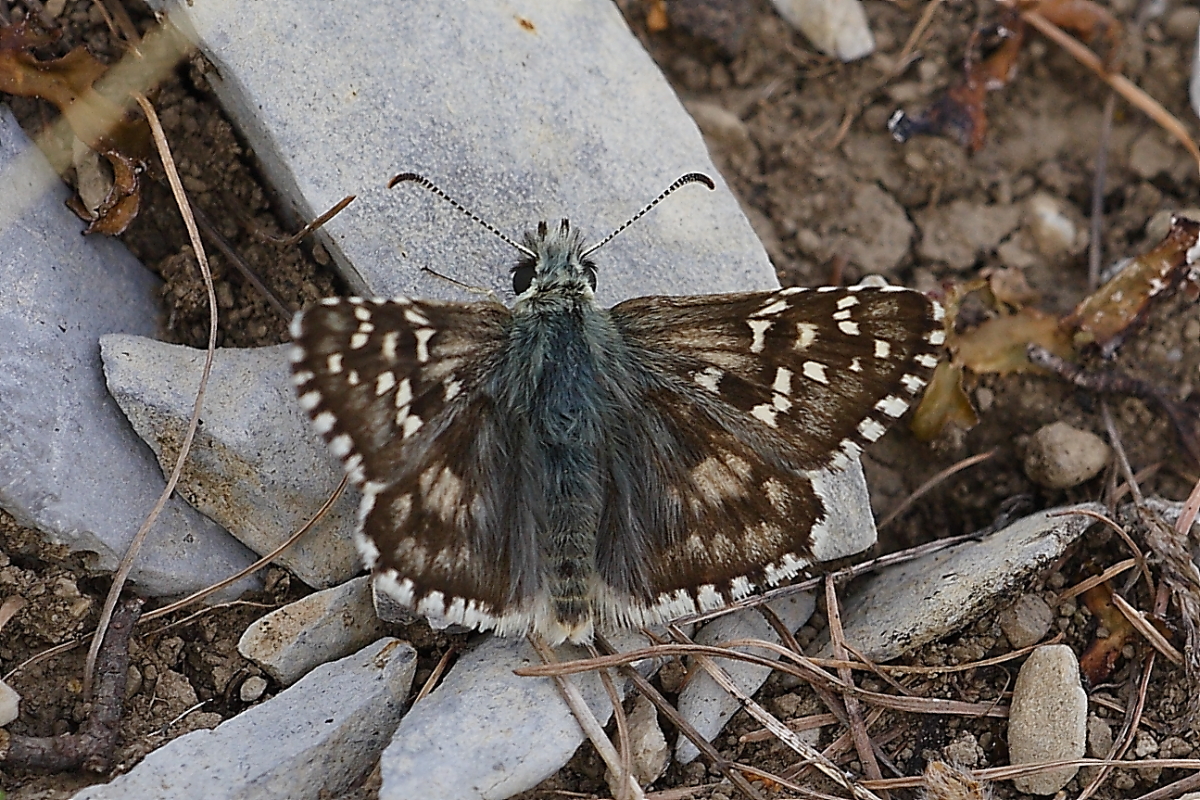 The Lafranchis ID book simply says that the uph marks are dull, which is hardly a unique differentiator. The unh ground colour is olive brown. Alveus is a relatively large Pyrgus, but only slightly larger than most of its cousins, so identification may be based more on this rather than analysis of the photograph. It has a wide altitude range, from 0 to 2100m and flies in June-August. |