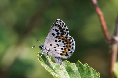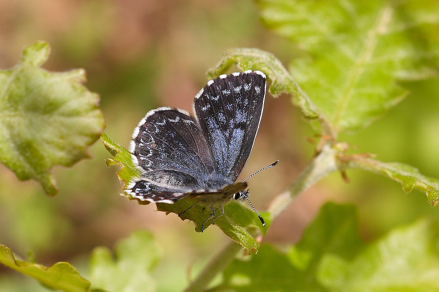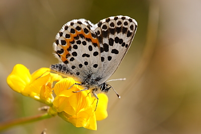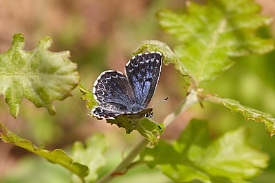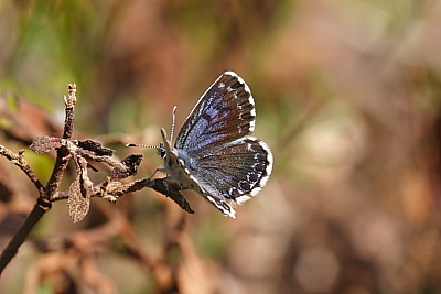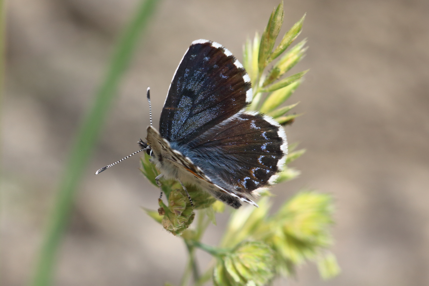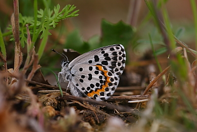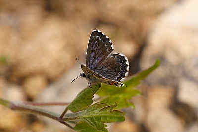 A rather untypical blue, unlike any other found in France - a rather dull upperside, lacking the usual resplendence of male blues, but having a very bright and distinctive underside. The female upperside is similar but usually black-brown with only a sprinkling of blue scales, although some females can be quite blue and some males less blue so that there is an area of cross-over.