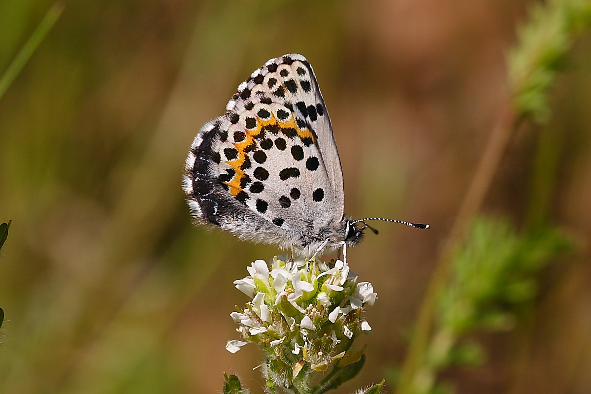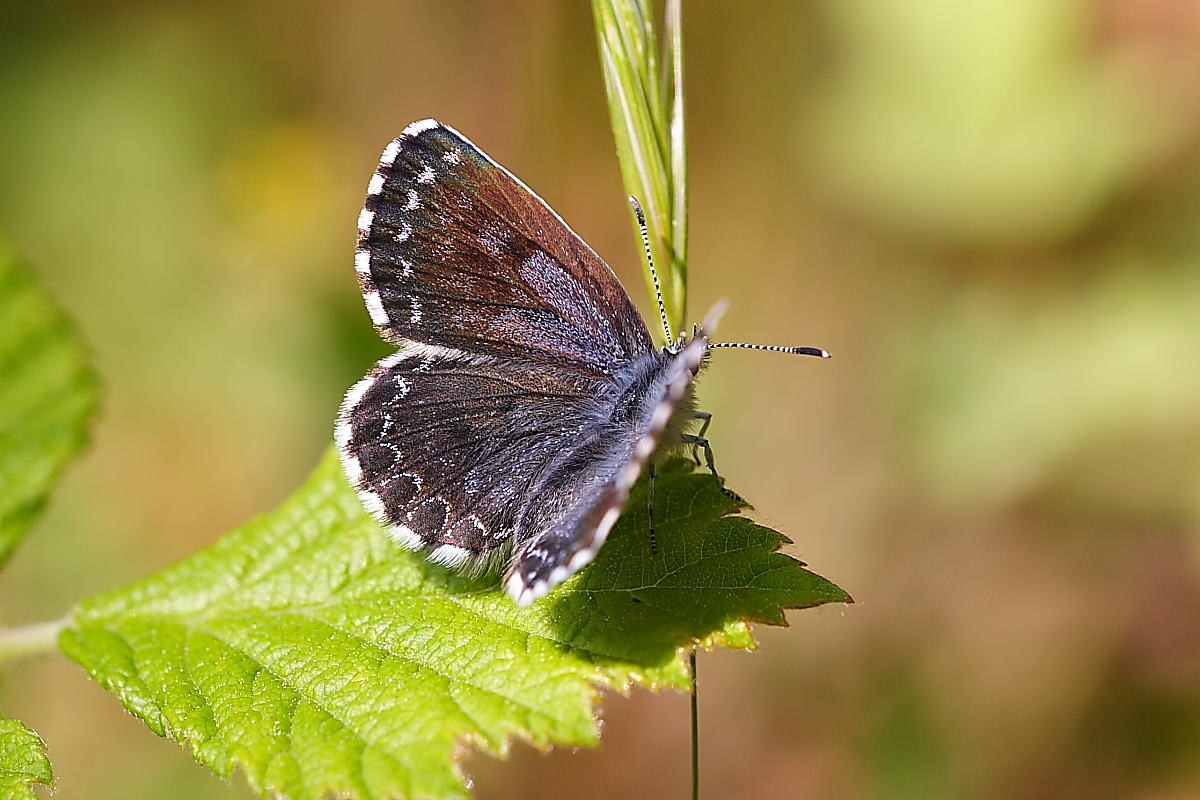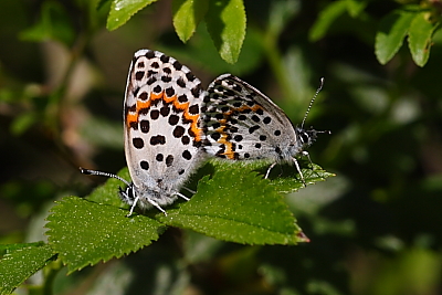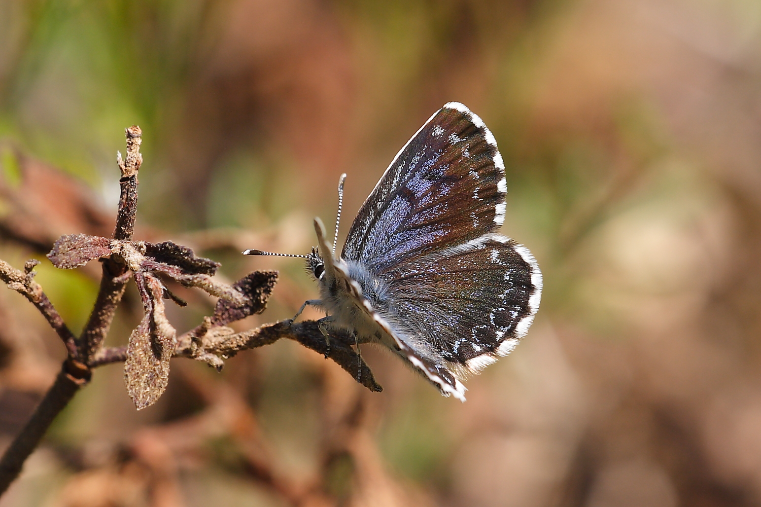 A rather untypical blue, unlike any other found in France - a rather dull upperside, lacking the usual resplendence of male blues, but having a very bright and distinctive underside. The female upperside is similar but usually black-brown with only a sprinkling of blue scales, although some females can be quite blue and some males less blue so that there is an area of cross-over.